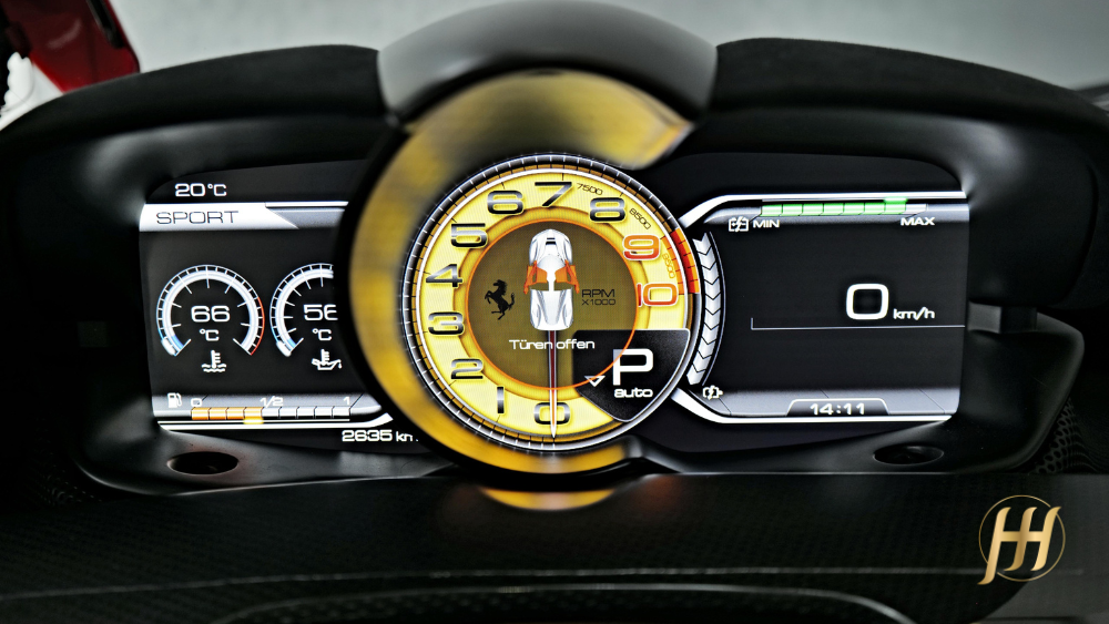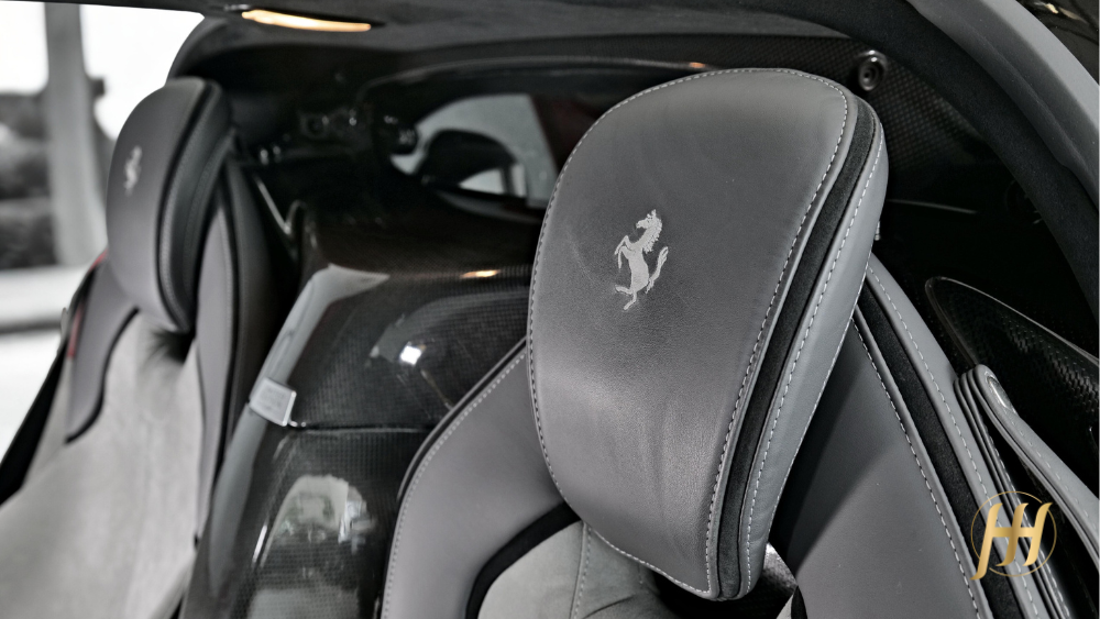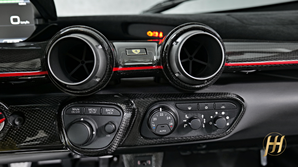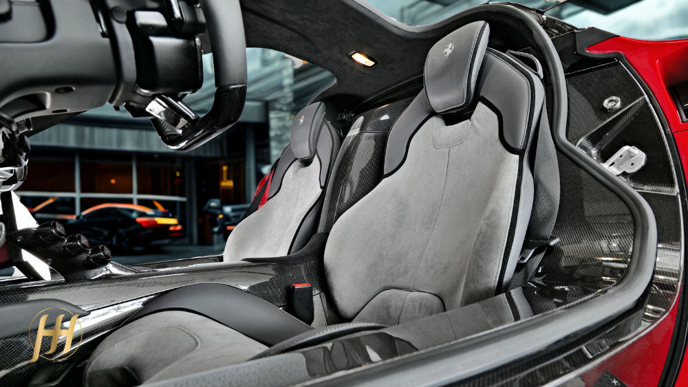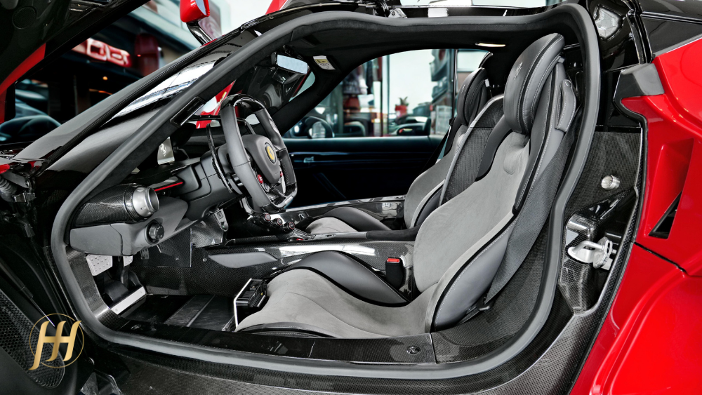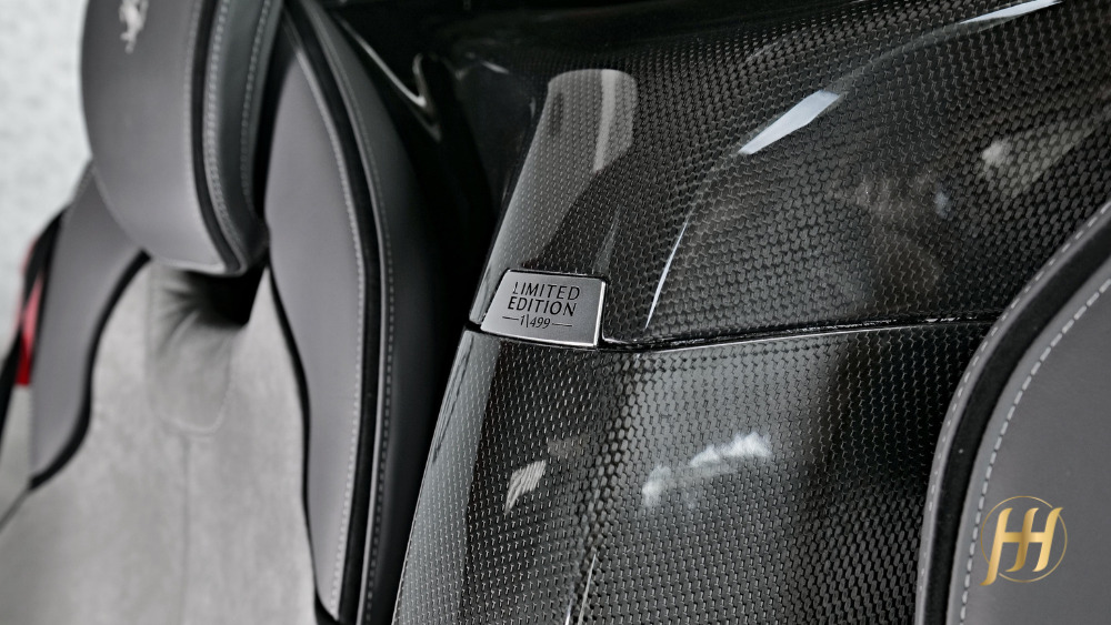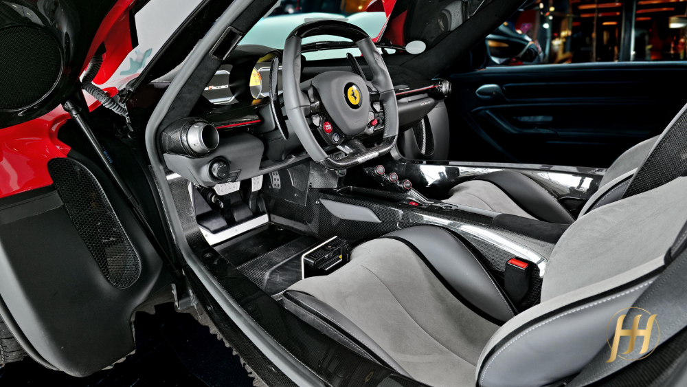 O design é uma obra-prima funcional: cada curva, cada entrada de ar e cada linha foi projetada para otimizar o fluxo aerodinâmico e gerar downforce, sem comprometer a pureza estética típica da Ferrari. O chassi monocoque é feito inteiramente em fibra de carbono, garantindo rigidez excepcional e leveza, enquanto o interior combina sofisticação minimalista e foco absoluto no piloto.