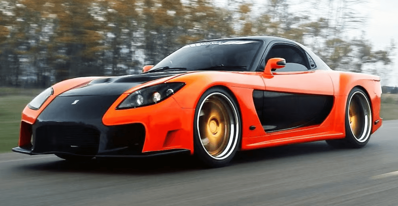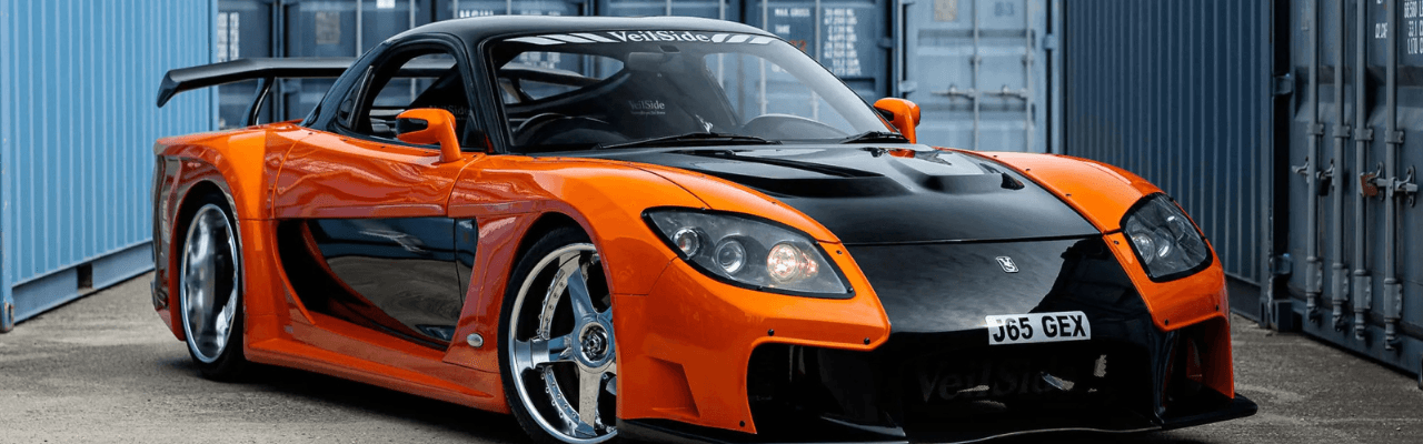 O grande salto mundial: VeilSide forneceu o Ford Mustang 1967 e especialmente o Mazda RX-7 “Han’s Edition” com kit Fortune completo para o filme. O RX-7 laranja/dourado virou um dos carros de cinema mais icônicos da história.